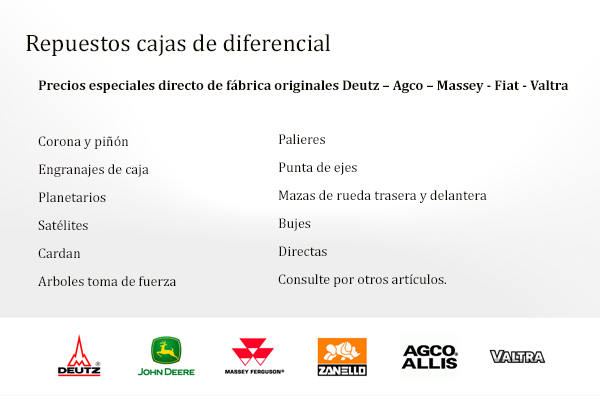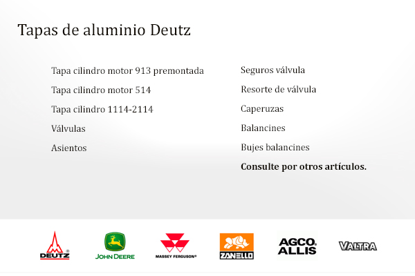 Contamos con un amplio stock de repuestos de la marca DEUTZ - AGCO ALLIS, entre otras. Repuestos para tractores, cosechadoras, motores y grupos electrógenos.